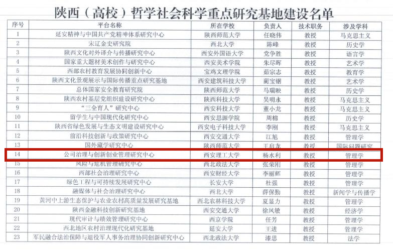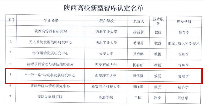 近日,陕西省教育厅公布2020年度陕西(高校)哲学社会科学重点研究基地建设和陕西高校新型智库认定结果,我校申报的“公司治理与创新创业管理中心”获批陕西(高校)哲学社会科学重点研究基地,“‘一带一路’与城市发展研究中心”被认定为陕西高校新型智库。