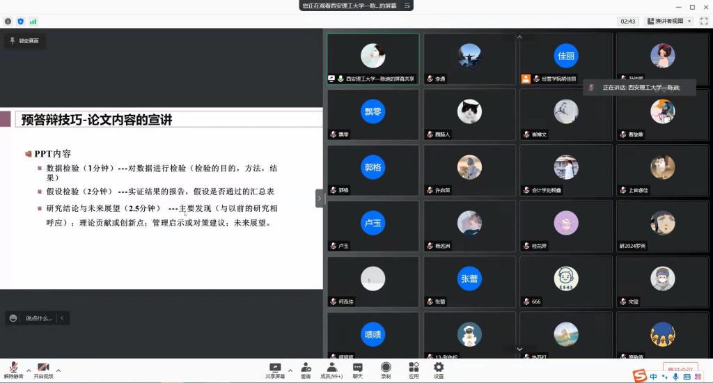 本次公开课以硕士三年级学生的预答辩、二年级的开题答辩指导及论文撰写为主要内容。陈迪细心向大家讲解了预答辩的技巧及注意事项,重点分享了PPT制作的要点,并提出了通过多种途径记录老师所提的问题的建议,从而为后期正式答辩和盲审的顺利通过做好准备;乔建麟以“研究方法及其如何应用?”“如何去分析数据?”等5个问题入手,对开题答辩进行了详细的讲解;尚宴莹为大家介绍了多个查找文献的渠道,鼓励大家在选择题目时多与导师交流沟通,并对写作小论文和发表论文流程进行了重点分享。