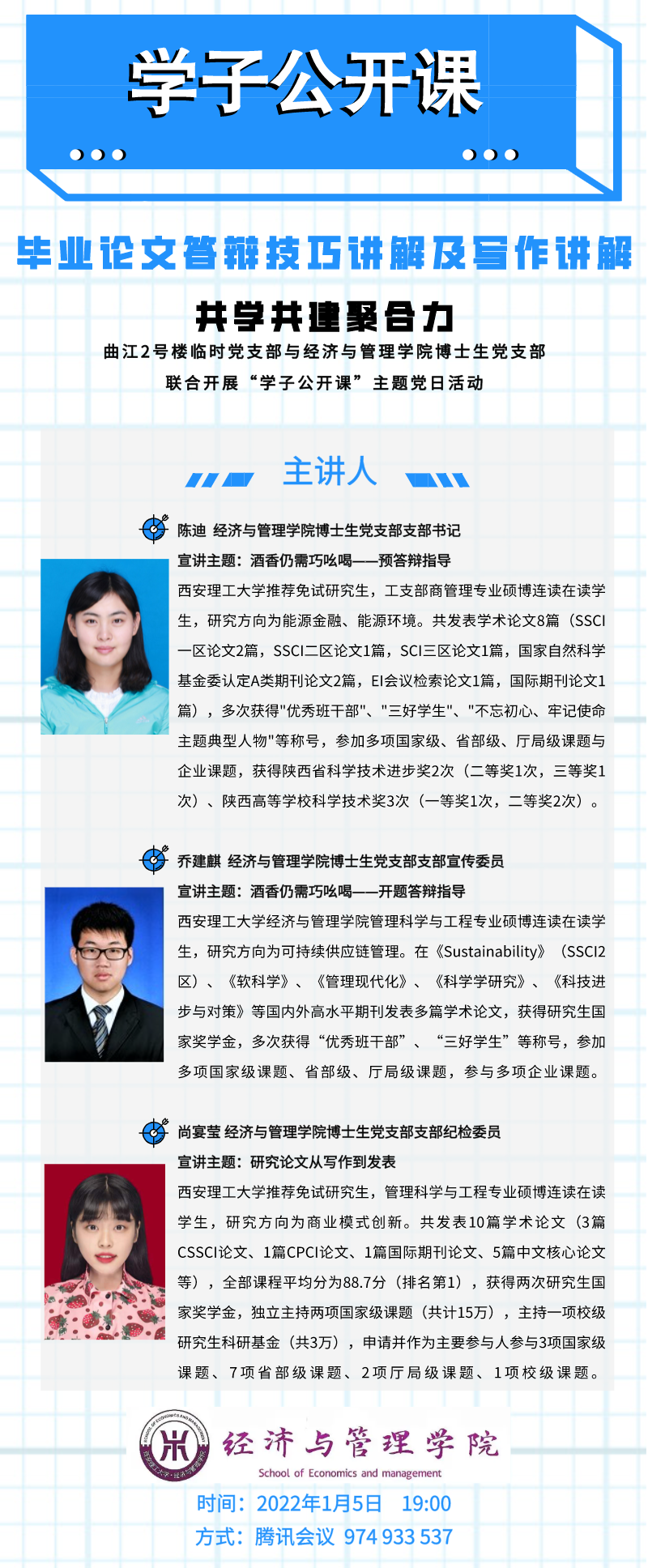 1月5日,70net永乐高平台博士生党支部与2号楼临时党支部联合开展以“毕业论文答辩技巧与写作讲解”为主题的“学子公开课”线上主题党日活动,活动邀请到博士生党支部书记陈迪、纪检委员尚晏莹、宣传委员主讲乔建麒,2号楼临时党支部100余名党员线上参与,活动由院研会崔博文主持。