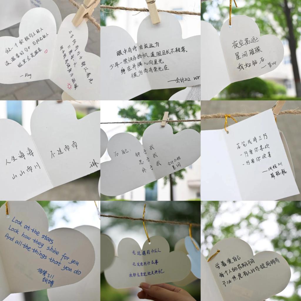 活动前期,学院依托多种线上、线下途径进行宣传,许多同学通过学院微信公众号、易班QQ空间等平台了解并参与到此次活动中来。本次活动收到了来自各个学院的同学们1000余份投稿,投稿内容丰富、情感真挚,有书写“长风破浪会有时,直挂云帆济沧海”的壮志豪情、也有抒发“山重水复疑无路,柳暗花明又一村”的乐观豁达,还有表达“海阔凭鱼跃,天高任鸟飞”的自由肆意,“写给自己的三行情书”充分展示了同学们对自我的认知和对理想的追求,让人切实感受到青年人朝气蓬勃的精神面貌和对未来生活的美好向往。