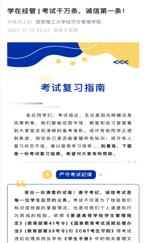 本次诚信教育系列活动的开展,不仅引导学生树立了正确考试动机,深入了解了考规考纪,也增强了学生对诚信考试的重视,有利于营造良好的学风、考风。未来,学院将持续做好诚信教育,进一步提高学生的诚信意识和社会责任感,展现经管学子良好的道德风貌。