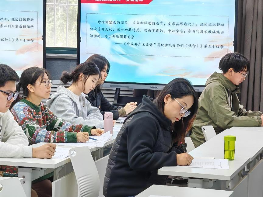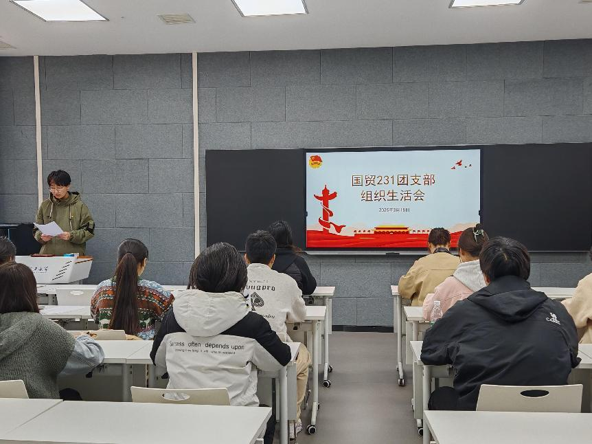 闫如玉领学《中国共产主义青年团纪律处分条例(试行)》。徐文哲向大会报告团员和青年主题教育专题组织生活会查摆问题改进落实的情况报告。团支部18名成员按照要求,既肯定成绩,又直指问题,以解剖麻雀的精神、“揭短亮丑”式的批评和自我批评。评议环节,团支部采取民主集中制的形式,通过“个人自评-团员互评-支委点评”的三级评议机制,现场发放测评表18张,最终评定优秀团员6名,合格团员12名,实现政治体检全覆盖。会议最后,荆霄进行总结点评。她讲到国贸231团支部工作“有亮点、有深度、有潜力”,尤其在思想引领与学风建设方面成效显著,给予了充分肯定。同时也提出三点期望:一是团员需要明确身份,根据团纪严于律己;二是要求全体团员珍惜环境、抓住机会,深化理论学习与专业实践的融合,增长才干;三是希望支部委员带头挖掘支部特色,协同构建更优秀的团支部。