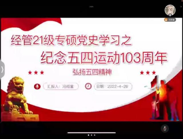 为引导广大学生党员积极传承红色基因努力延续革命薪火充分发挥党员的先进模范作用,五四运动103周年来临之际,经济管理学院2021级专硕党支部53在线上开展了赓续革命薪火 激昂五四精神专题党史学习教育本次活动由2021级专硕党支部宣传委员冯雨童主持。