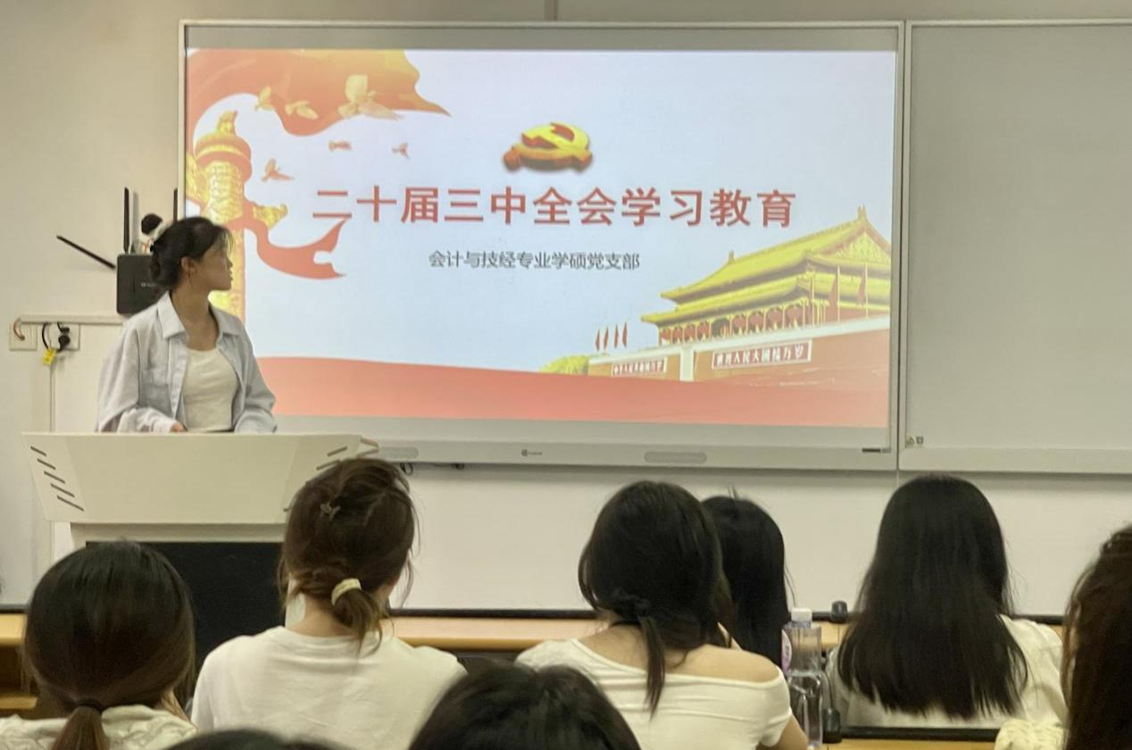 为深入学习贯彻党的二十届三中全会精神,认真学习贯彻《中共中央关于进一步全面深化改革、推进中国式现代化的决定》,9月10日,70net永乐高平台会计与技经党支部开展了学习贯彻落实党的二十届三中全会精神的主题活动。全体党员、部分积极分子参加此次学习,会议由支部书记李茹茹主持。
