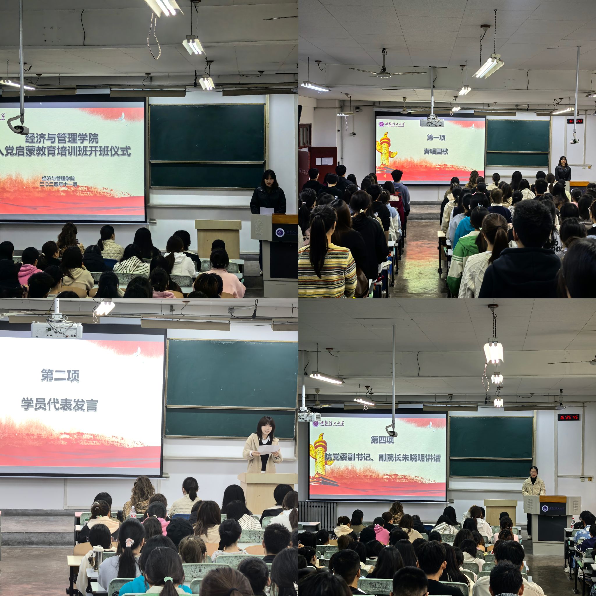 开班仪式在庄严的国歌声中拉开帷幕。会议伊始,工管类243陈心怡作为本期学员代表发言,她表示要不断学习党的先进思想与理论体系,努力学习专业知识,提升自己素质与能力,以实际行动证明自己的决心和信念,争取早日成为一名合格的共产党员。随后,辅导员黄博琳介绍本次入党启蒙教育培训班的具体安排和纪律要求,她希望同学们能严格课堂纪律,遵守课程规定,圆满完成培训任务。最后,院党委副书记兼副院长朱晓明做开班讲话,朱老师强调入党启蒙教育是引导广大青年学生树立正确的世界观、人生观、价值观,坚定共产主义信仰,积极向党组织靠拢的重要途径,她希望同学们能够认真学习党的理论知识、积极参加实践活动、严于律己、以身作则、勇于担当、敢于奉献,为成为一名优秀的共产党员做好充分准备。
