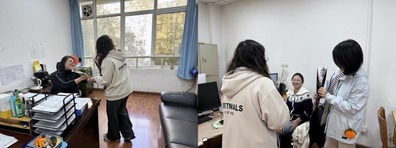 活动现场,支部党员们带着满满的心意步入办公室,将花束与贺卡逐一送到女教师手中,一声声清脆的“老师,妇女节快乐”,让春日的校园漾起温暖的涟漪。女教师们接过这份突如其来的惊喜,与学生们亲切交谈,接受这份来自学生的暖心关怀。