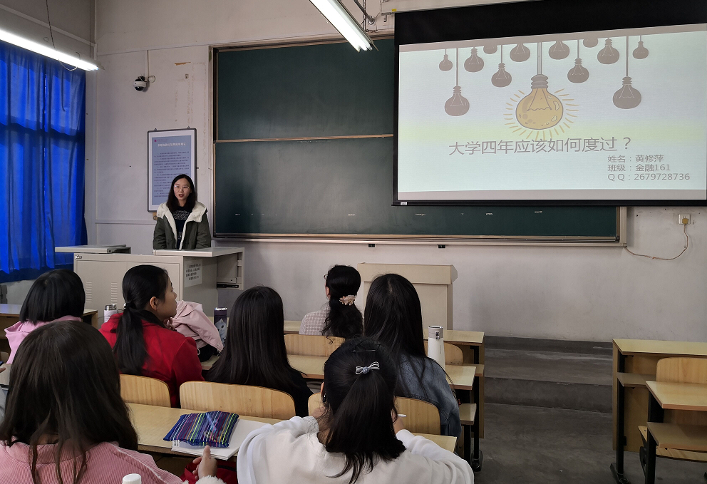 11月14日下午,金融182和金融192全体学生在教八楼311举办了“金融学本科生经验交流会”。金融161班优秀保研生黄修萍担任主讲人,以“大学四年应该如何度过”为主题给学弟学妹们分享了她的学习经验和生活经验,财会金融系沈燕老师和杨沁老师组织并参加会议。