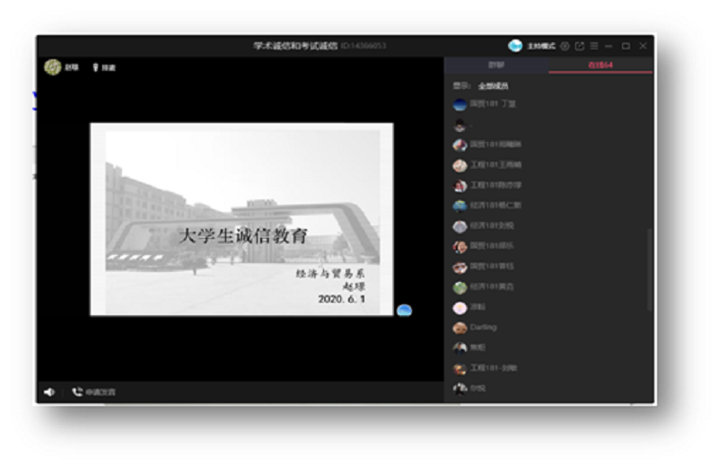 为进一步强化我院学生的诚信意识,培养学生诚信品质,引导学生树立求真务实、言行一致的诚信形象,构建诚信校园,营造良好学风考风,6月1日下午,经管学院赵璟教授在腾讯群课堂为大二学生做了主题为“学术诚信和考试诚信”的讲座。