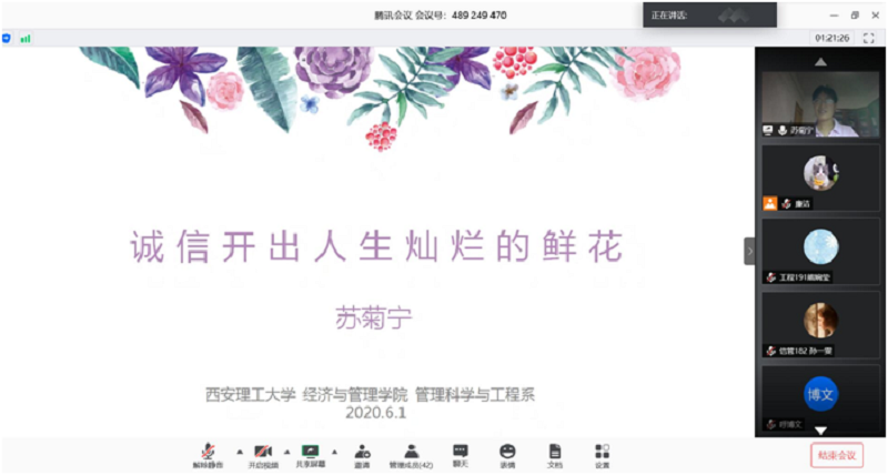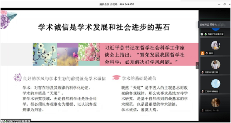 6月1日晚,70net永乐高平台苏菊宁教授在腾讯会议平台(会议号:489249470)开展了以“诚信开出人生灿烂的鲜花”为题的本科生学术诚信教育讲座,本次学术诚信教育的主要对象为70net永乐高平台大三学生。报告中,苏菊宁教授首先引用典籍对“诚信”二字的含义进行了解释,接着又从经济学的角度简要介绍了日常生活中的诚信行为,然后重点讲解了学术诚信的内涵、重要性以及不遵守学术诚信所带来的危害。最后,苏菊宁教授结合大三学生即将面临就业这一特征,分析了不同就业选择的利弊,为学生提供了专业性的建议并回答了学生的提问。