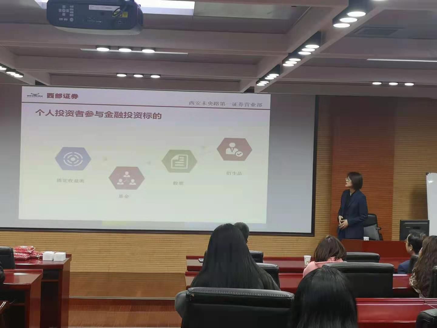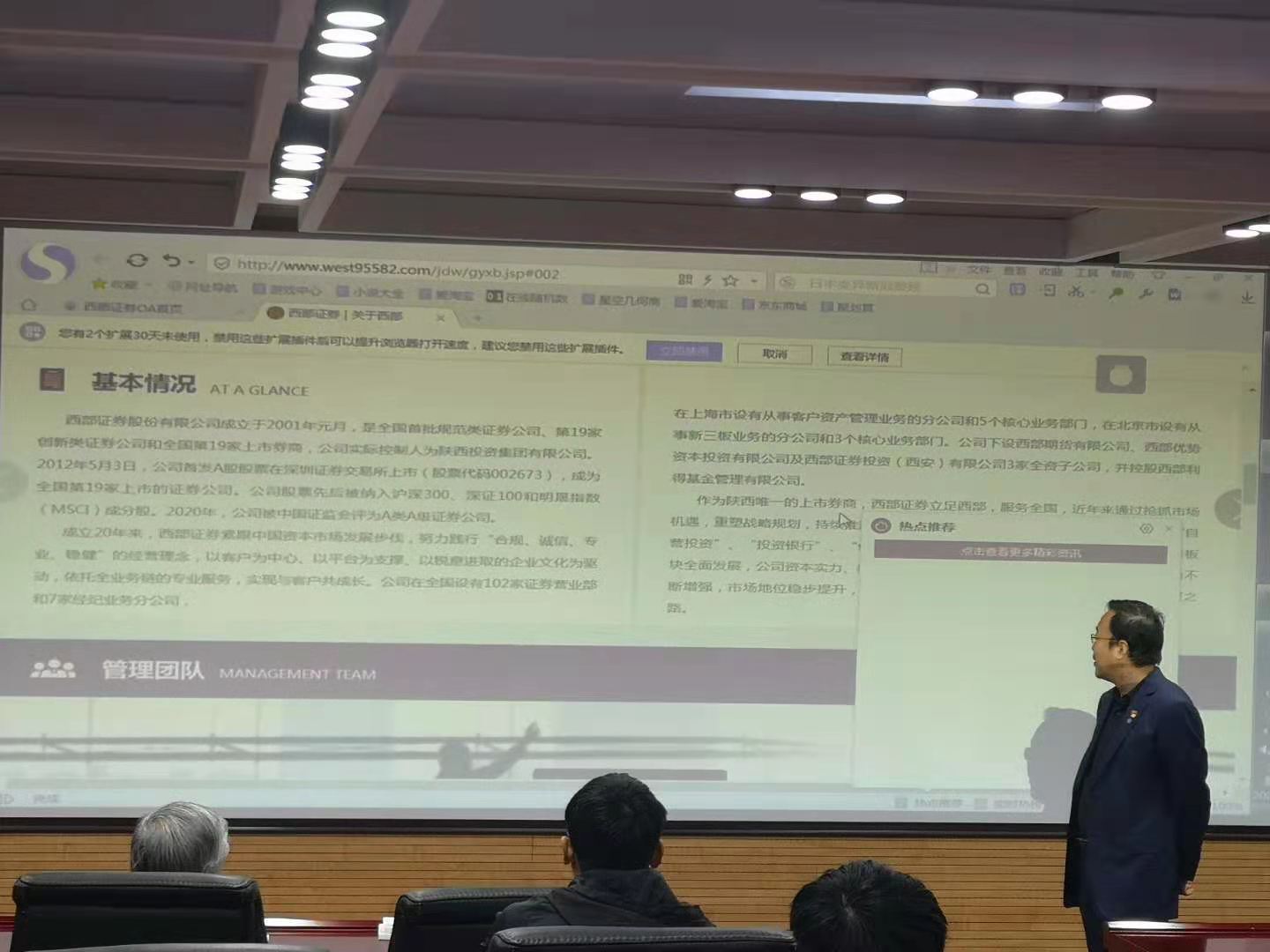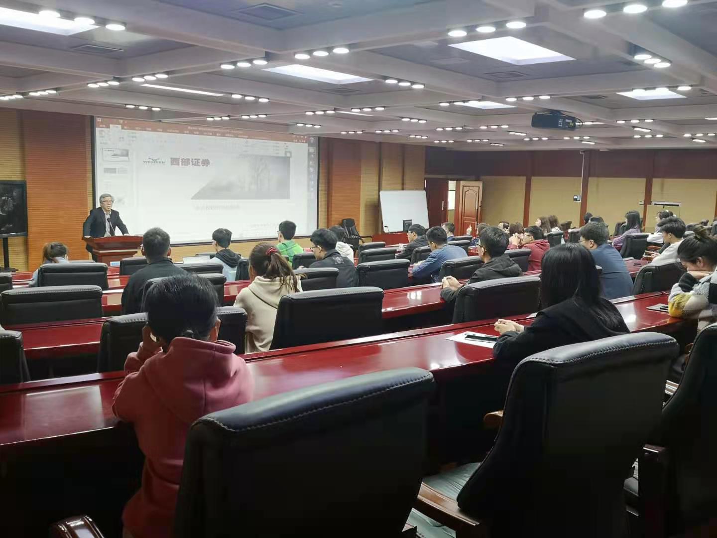 最后,蒋伟向大家讲解了证券行业的现状和前景,并对有意向从事证券工作的学生提出宝贵建议。他向大家介绍了西部证券的现状与发展战略,希望同学们积极应聘。