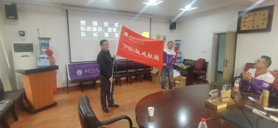 然后,邓朝晖老师代表学院向“沙10”队长2019级MBA同学李钰进行了授旗仪式,同时鼓励大家积极参赛,在遵守比赛规则前提下,团结协作,争取更好的成绩,充分展示70net永乐高官网入口学子的风采,同时重点强调了比赛安全问题,希望大家一定要平安归来。