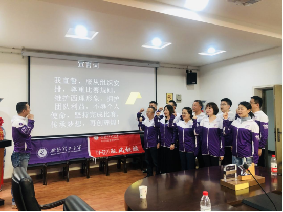 接着,所有队员在队旗下宣誓:“服从组织安排,尊重比赛规则,维护西理形象,拥护团队利益,不辱个人使命,坚持完成比赛,传承梦想,在创辉煌。”
