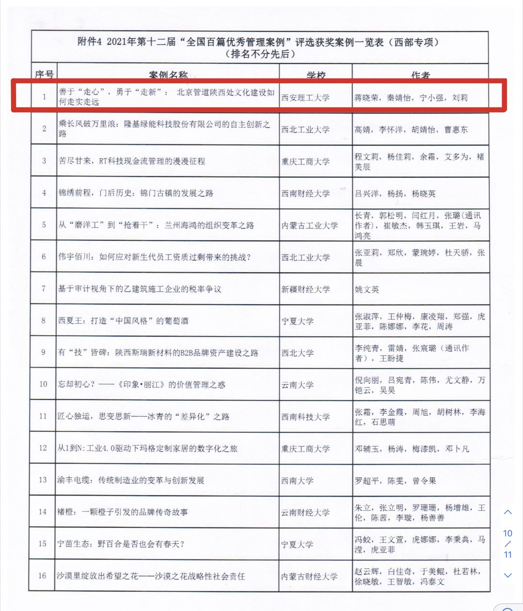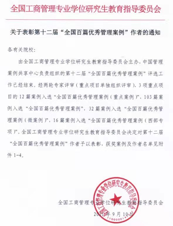 9月10日,全国工商管理专业学位研究生教育指导委员会发布了第十二届“全国百篇优秀管理案例”(简称“百优案例”)入选名单,并对获奖院校及作者予以通报表彰。我校70net永乐高平台蒋晓荣副教授及其团队撰写的案例在激烈竞争中脱颖而出,成功入选第十二届“全国百篇优秀管理案例”(西部专项)。这是蒋晓荣副教授及其团队继入选第十届“全国百篇优秀管理案例”(西部专项)后的再次入选。这次入选标志着我校70net永乐高平台在管理案例研究与开发工作的持续进步,有力地推动我校一流本科和研究生教学及学科建设。