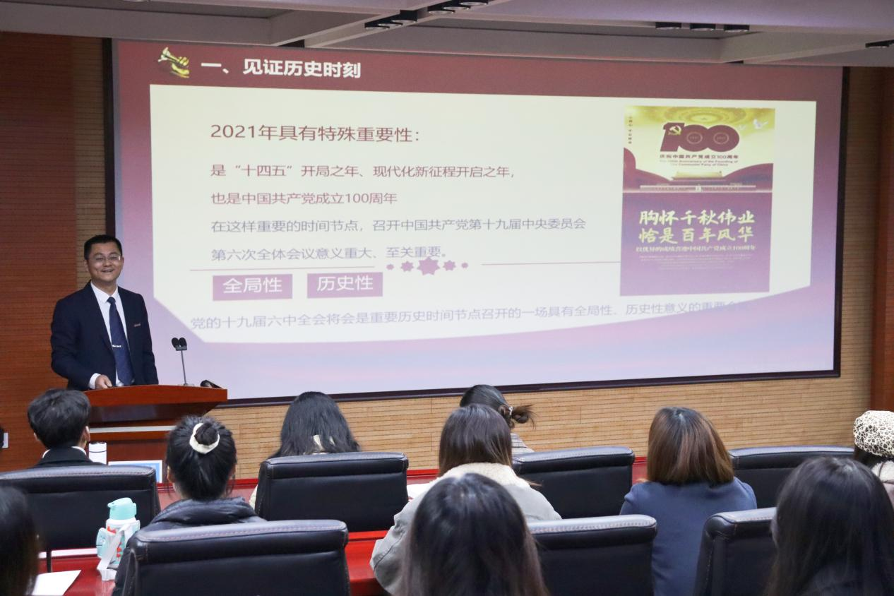 马宁副书记以《百年奋斗启新程 以史为鉴 开创未来——学习贯彻中国共产党第十九届中央委员会第六次全体会议精神》为主题,首先对十九届六中全会基本概况作以介绍,接着从“见证历史时刻”、“创造伟大成就”、“坚持宝贵经验”、“不负伟大梦想”四个方面对十九届六中全会公报内容进行系统阐述,结合党和国家的发展历程与当下国际形势,用深入浅出的语言和生动鲜活的事例阐释了“两个确立”、“四个伟大成就“、“五大历史意义”和“十个坚持”的丰富内涵和深远意义,对决议的重大创新和亮点展开深入解读。最后,马宁副书记引经据典,对党的三次历史决议进行梳理,引导学生更好地学习、认识这次历史决议的重大现实意义和深远历史意义,为学生上了一堂生动的形势与政策课。