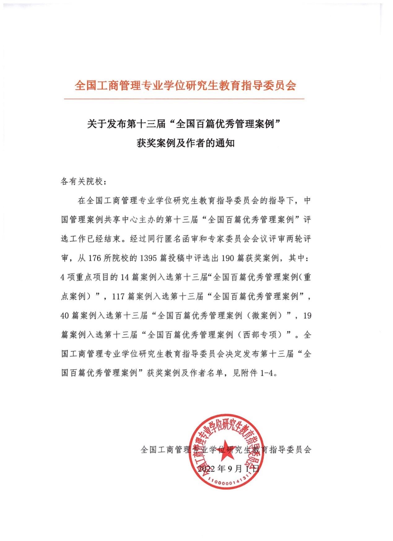 “全国百篇优秀管理案例”是全国工商管理案例领域的最高奖项,自2012年起,教育部将各院校获得“全国百篇优秀管理案例”的数量纳入工商管理学科评估指标体系。本届评选于2022年3月21日启动,全国176所院校的1395篇案例参与评选,平均入选率为13.62%。