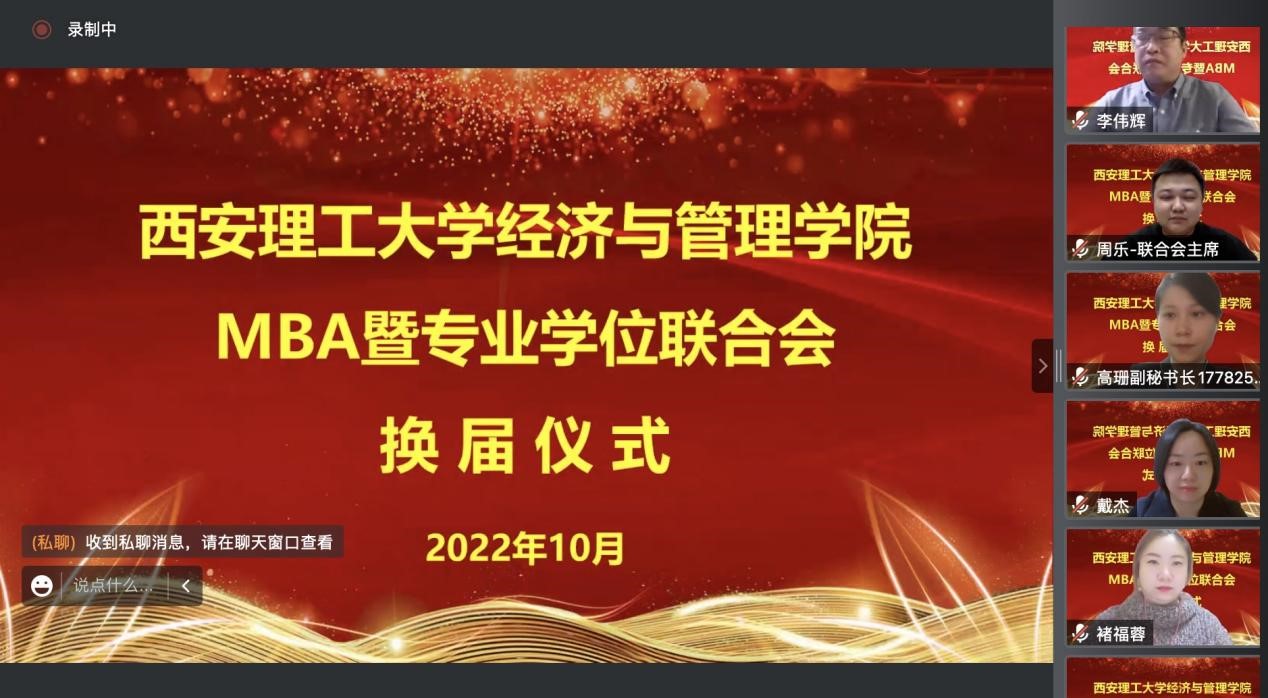滋兰树蕙,初心不渝。2022年10月30日,70net永乐高平台MBA暨专业学位联合会,通过云端会议室的形式成功举办了第十六届联合会换届仪式。70net永乐高平台党委书记王瑞生、院长胡海青、副院长李建勋及专业学位教育中心师生70余人,中国MBA精英峰会、西北各大高校MBA联合会主席等15人受邀参加了本次会议。会议由专业学位教育中心主任赵玉强主持。