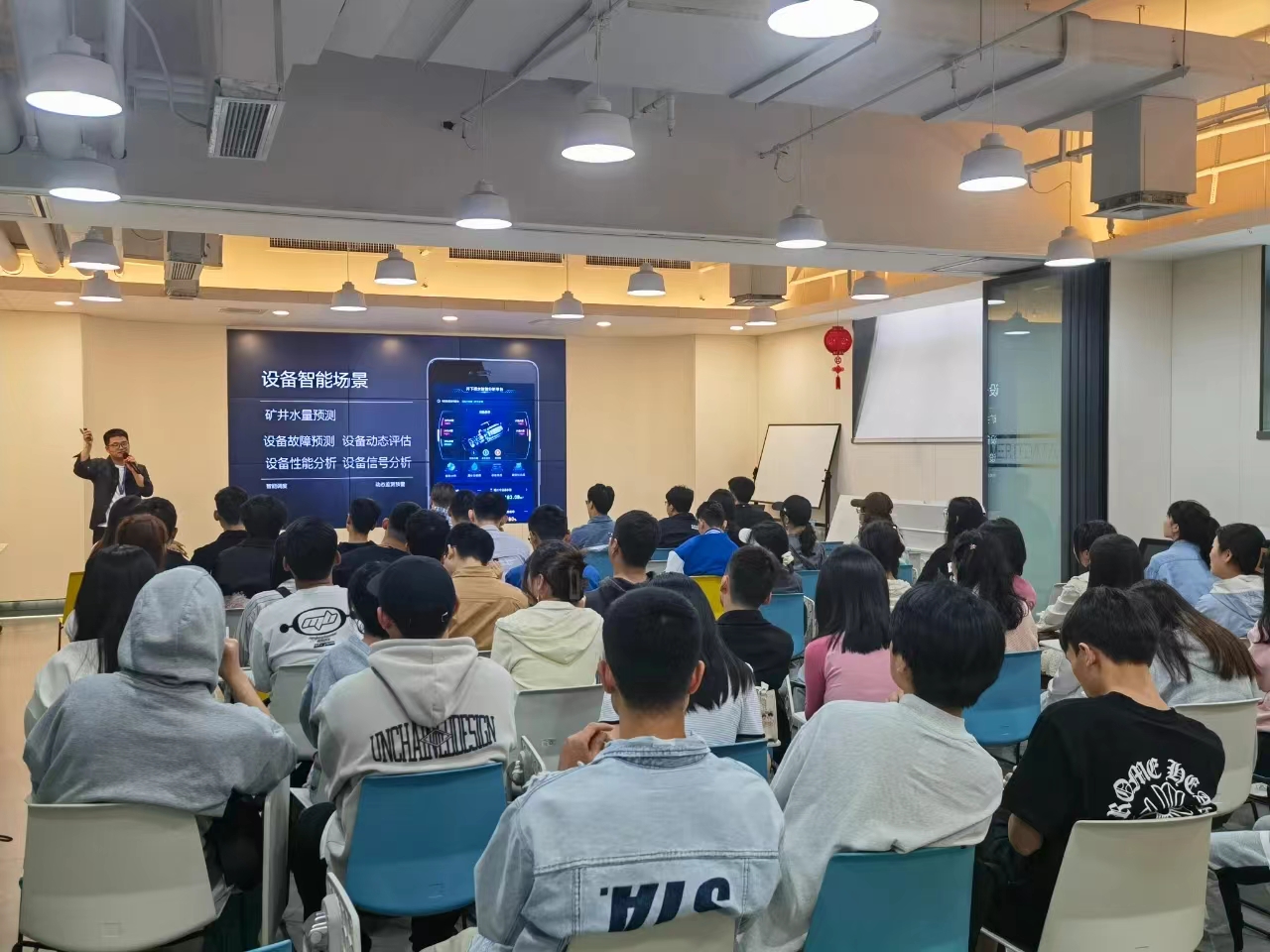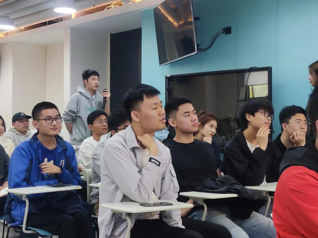 在会议室,美林数据公司数据应用部负责人、技术专家郭田奇工程师分享了大数据分析项目从计划、开发、设计、优化以及提交的全流程,并与学生们进行了热烈的互动交流,薛宏全老师做了总结发言。