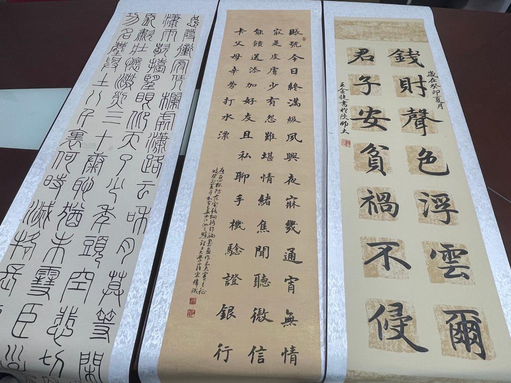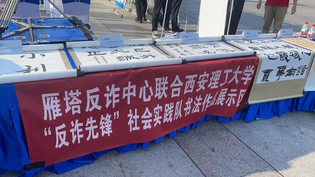 活动现场,围绕宣传贯彻《反电信网络诈骗法》、提高群众防骗意识和识骗能力,精心编排演出了歌曲、快板、现场播报等文艺节目,制作摆放了各类反诈宣传展板。主办方还为学院反诈实践队设置了专门展位,展示了实践队精心组织创作的31幅防范电信网络诈骗书画作品。