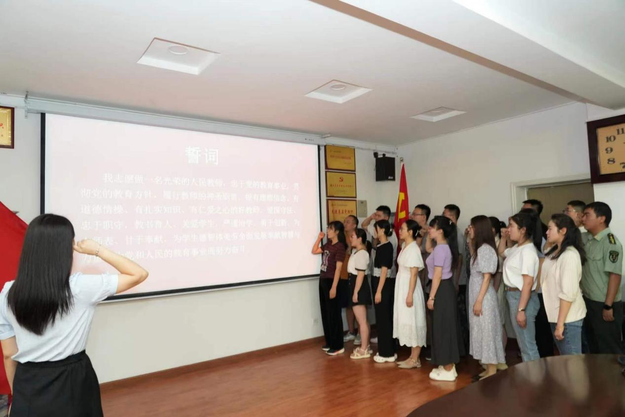 在青年教师陈迪领誓下,教师面对国旗,庄严宣誓。在教师职业的自豪感和责任感中,新入职教师许下了庄严的承诺。