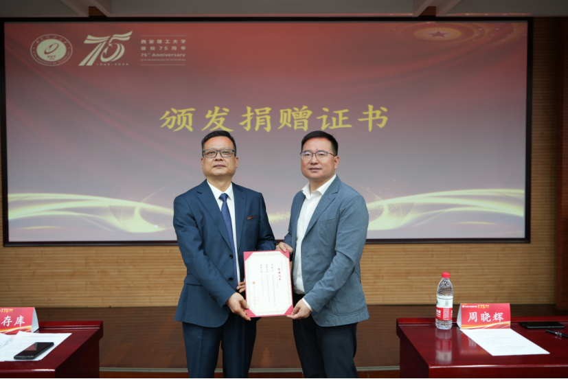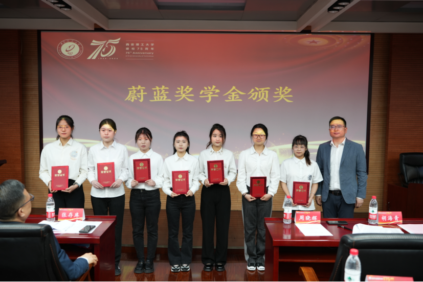接下来,学院介绍了蔚蓝奖助项目。陕西蔚蓝节能环境科技集团有限公司总经理王伟为获得蔚蓝奖助项目的部分学生代表颁奖,张存库副校长为王伟总经理授予了70net永乐高官网入口晓有教育基金会捐赠证书。