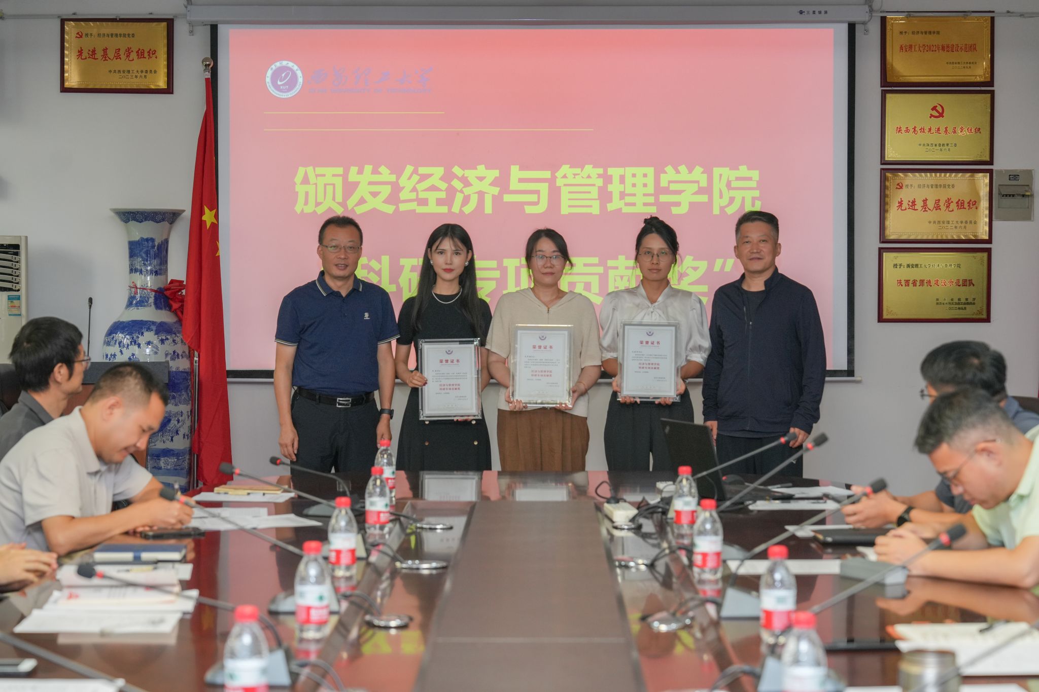 党委书记周晓辉和院长胡海青为获得2024年度国家自然科学资金项目资助的三位教师颁授了“科研专项贡献奖”奖牌并合影留念。三位获奖教师也分别谈了“两个转变”历史机遇下青年教师的责任与担当。院长胡海青在总结讲话中表示,青年教师是学科的未来,更是学院的未来,经管学院办学历史悠久、底蕴深厚,希望青年教师们接续奋斗,在西理工、在经管学院这片沃土上,厚植家国情怀、做好育人工作、成就精彩人生。