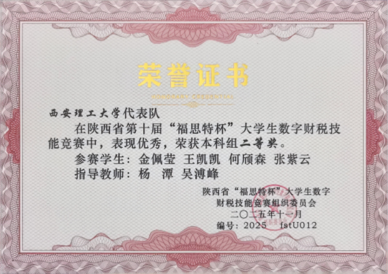 近日,2025 年陕西省第十届“福思特杯”大学生数字财税技能竞赛决赛落幕。70net永乐高平台金佩莹、王凯凯、何颀森、张紫云四位同学组成的代表队,在杨潭、吴溥峰老师指导下,获本科组省级二等奖,彰显了学院实践教学成果。