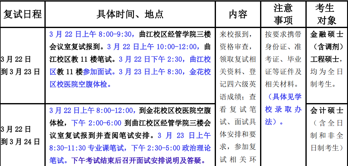 5、如国家对研究生招生考试招生政策以及复试工作有新的要求和规定,以国家政策为准,学院将根据学校安排修订相应的安排。为了节省各位考生的时间,我们复试各环节安排紧凑,需要同学们往返金花校区和曲江校区两地(相距约 4 站路,出租车费约 12 元左右)。希望同学们提前熟悉交通线路,合理安排时间,顺利完成各项复试环节。