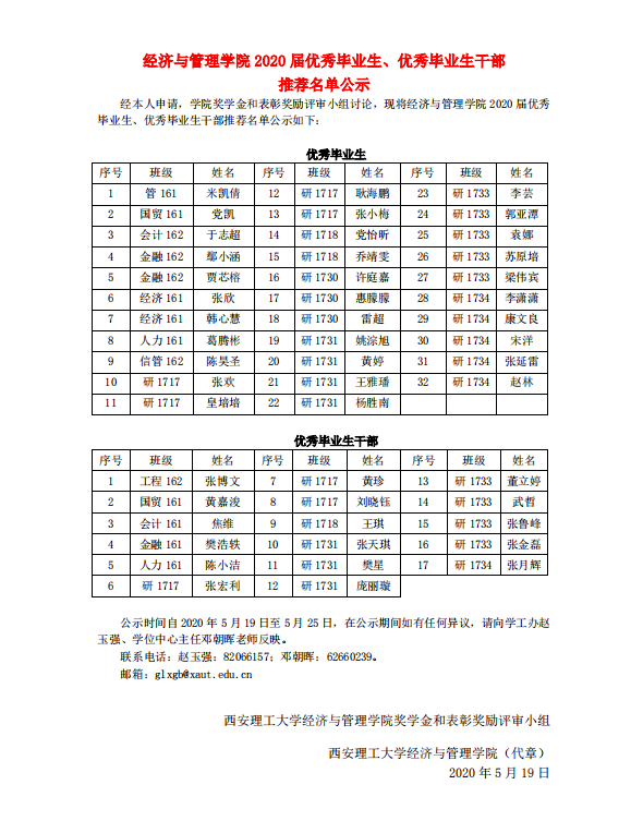 70net永乐高平台2020届优秀毕业生、优秀毕业生干部推荐名单公示