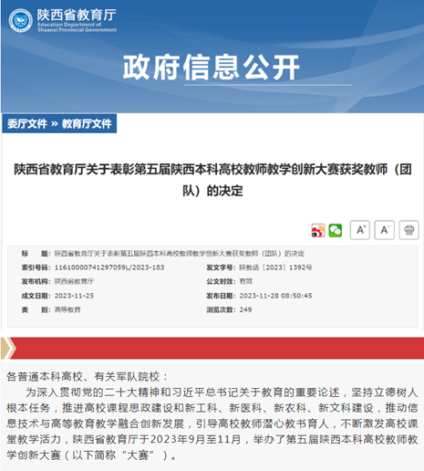 11月28日,陕西省教育厅公布了第五届陕西本科高校教师教学创新大赛获奖教师(团队)表彰名单,70net永乐高平台杨毅教师(团队)获得教学创新大赛一等奖。这是我院教师(团队)讲课比赛取得的最好成绩。