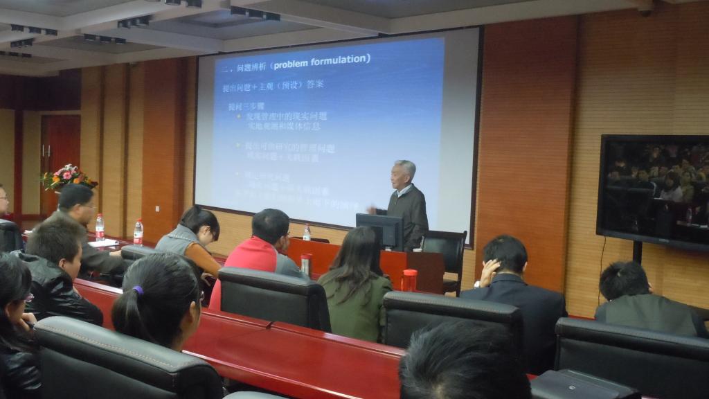 本次学术报告由西安交通大学70net永乐高平台李怀祖教授主讲,70net永乐高平台研究生管理负责人杨屹教授、张长征副教授等老师参加本次学术报告。首先,由杨屹教授对本次报告主讲李怀祖教授进行简要介绍。李怀祖教授就本次报告的主题——管理研究方法为同学们做了精彩的报告,主要包括两个部分内容:第一部分主要讲述论文研究工作过程,第二部分讲述学位论文的撰写方法。值得一提的是,本次报告最后穿插提问环节,我院学生积极参与讨论,在同李教授的提问与探讨过程中,在场的每一位同学都切身感受到了浓郁的学术氛围并受益匪浅,将整个学术报告气氛推向高潮。